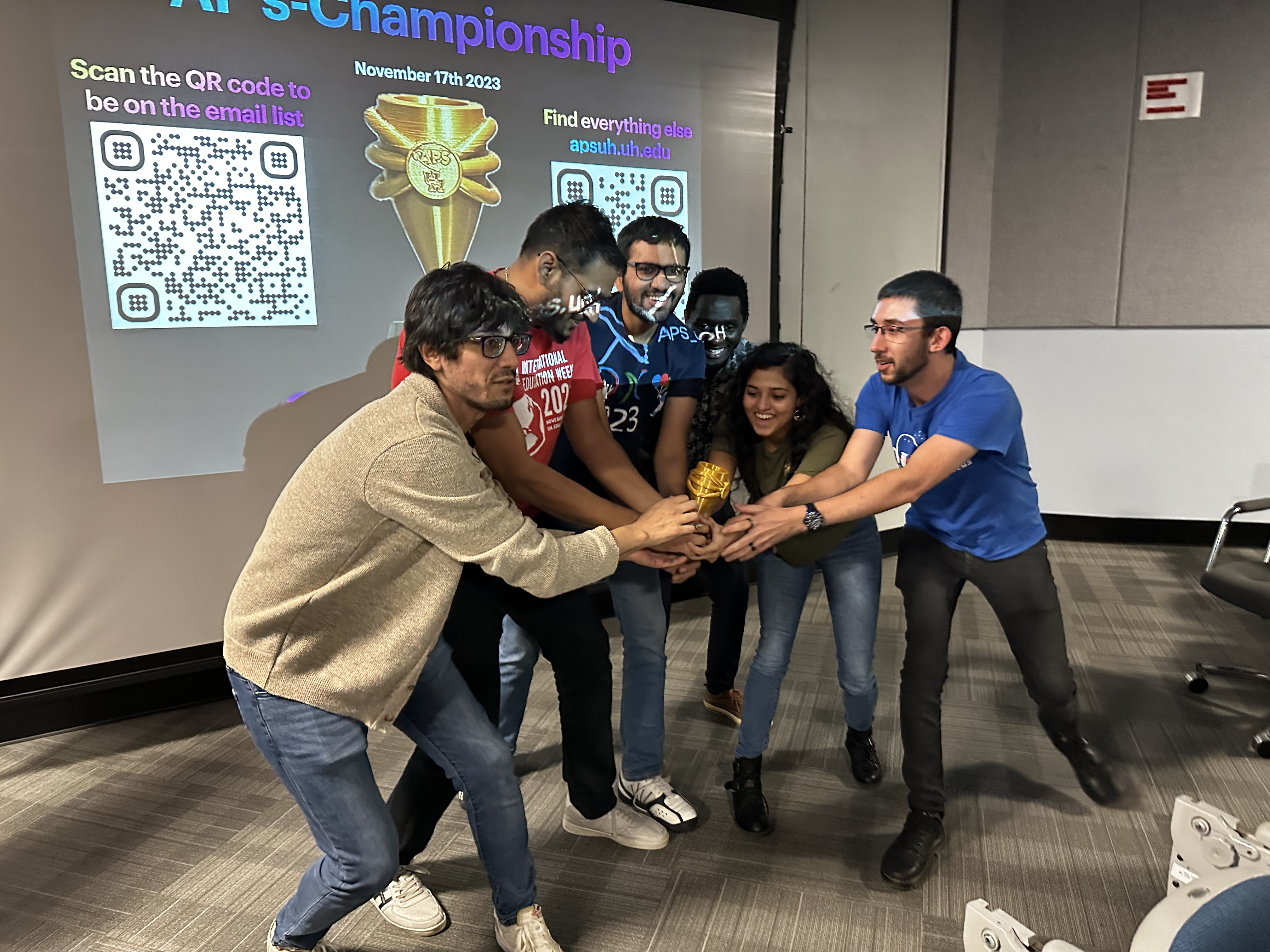 APS-Championship 2023 was held at University of Houston Department of Physics. The 'S' in the title is part of the trivia so you will only have to settle with an educated guess right now. The first installment saw an outstanding participation by students (both graduate and undergradute). The event was a cumulative, almost like a 'triathlon' of physics trivia, emoji guess, questions, and a round of Mario Kart. The team that won was awarded a trophy. The night ended with pizzas and soda.